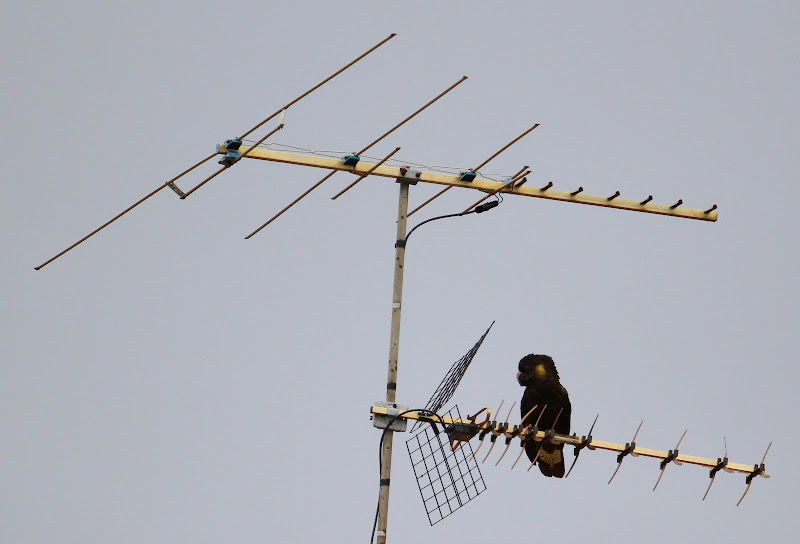 we heard a bird sound that we had never heard around the house so we looked out side. Across the street, we saw 4-5 Yellow-tailed black cockatoos in the neighbor's tree and on their TV antenna. We usually don't see these in our neighborhood so this was a nice surprise.